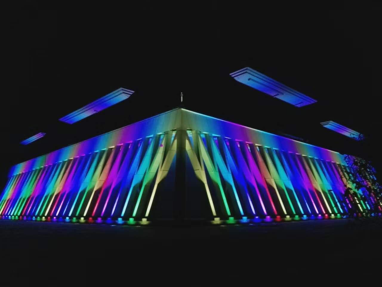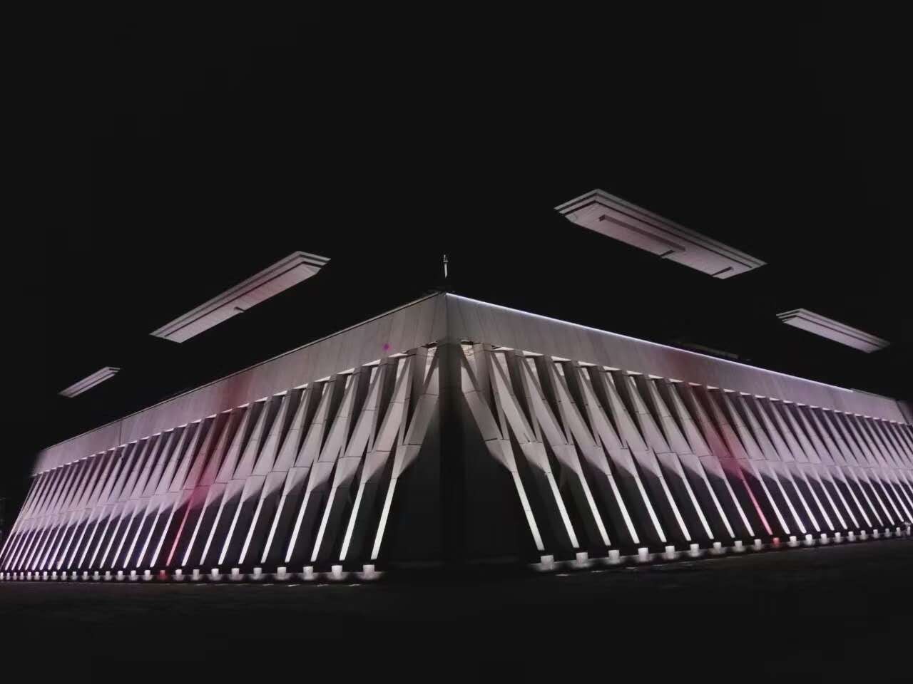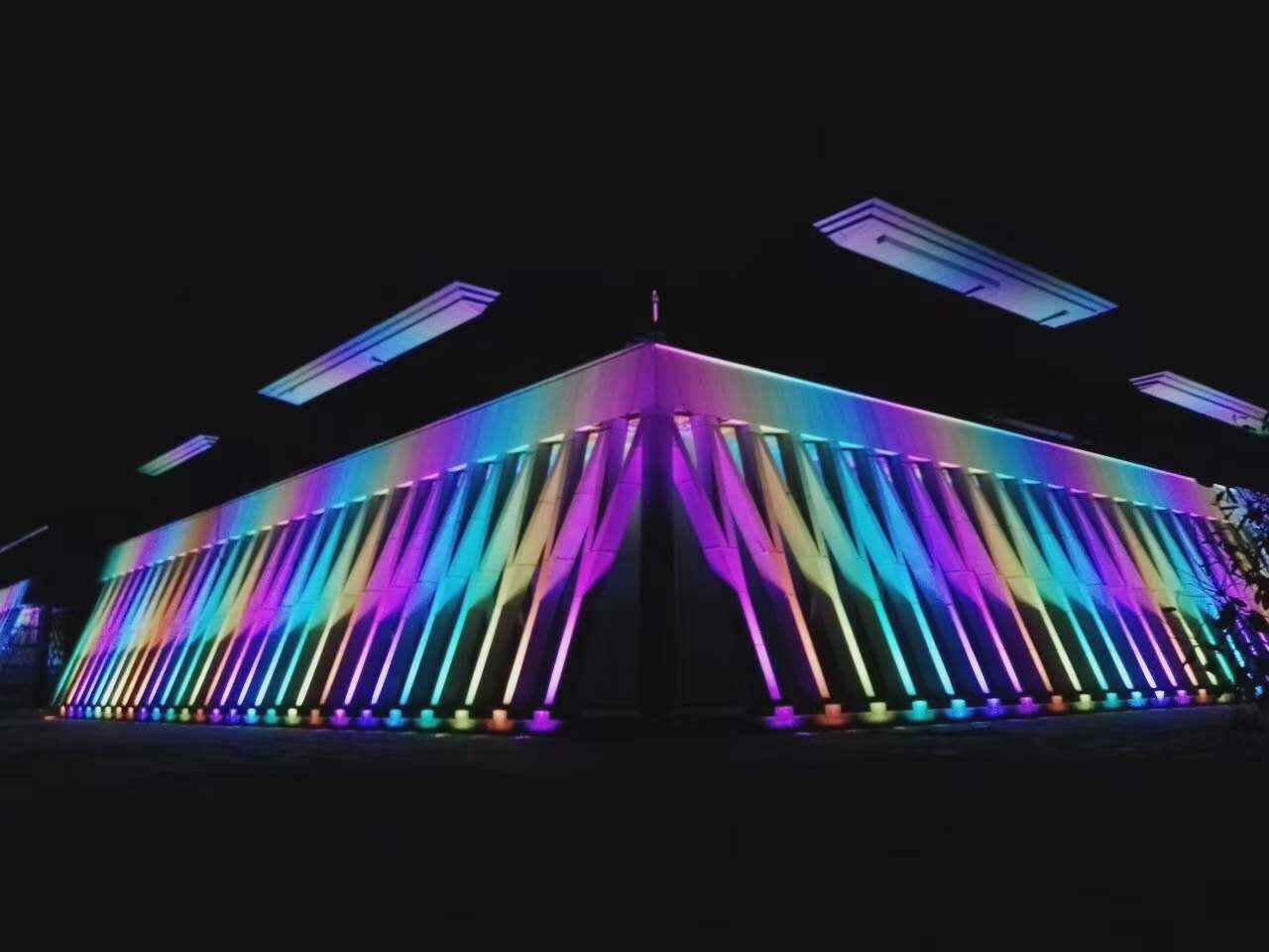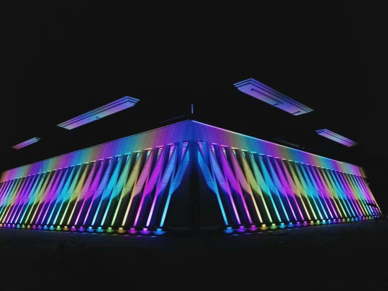 日照文化广场四面有斜柱子结构,我们使用了256台防水六色帕灯对柱体进行照明,通过DMX512控制流水,波浪各种特效进行编程,达到绚丽夺目的效果,这是一处标杆性的亮化工程。